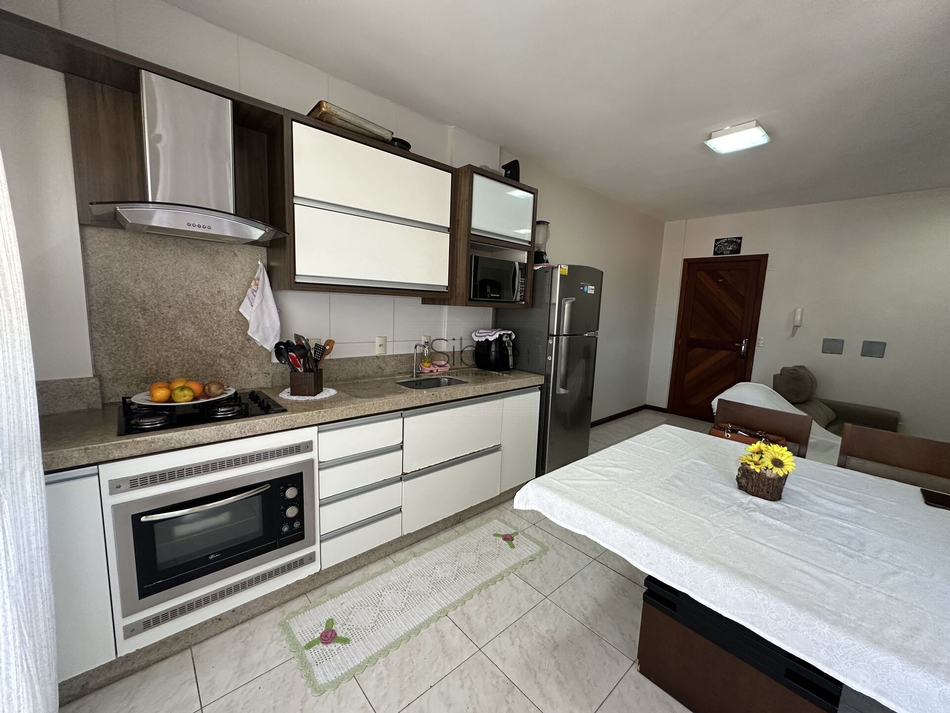 Apartamento semimobiliado, com 3 dormitórios, cozinha integrada à sala de estar/jantar, sacada, banheiro social, área de serviço e garagem coberta.