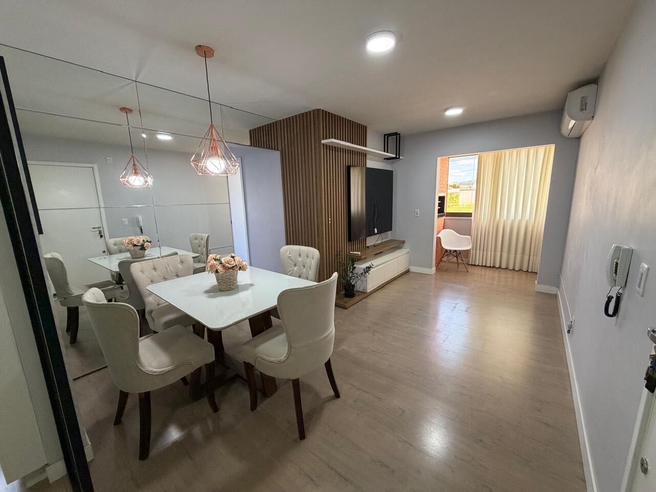 Imóvel pronto para morar, com 3 dormitórios, ar-condicionado em todos os ambientes e móveis planejados. Cozinha equipada com geladeira, forno e micro-ondas, além de mesa de jantar.