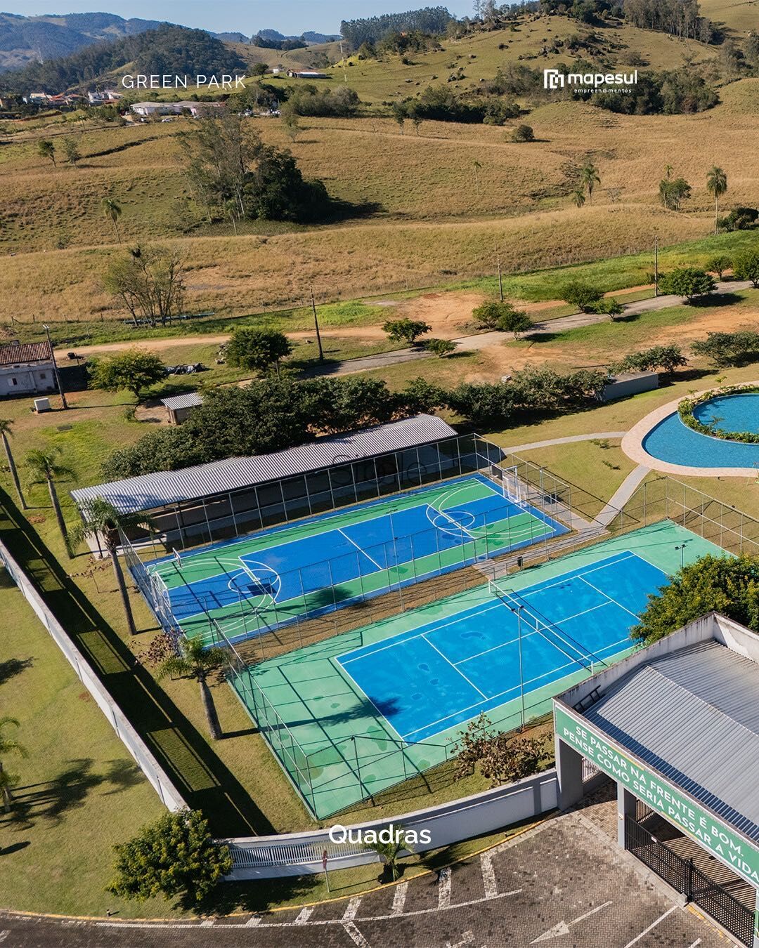 Estrutura completa: piscina de 800m², academia, salão de jogos, brinquedoteca, quadras esportivas, campo de futebol, playgrounds, espaço pet, capela privativa e até haras e galpão crioulo com cavalos à disposição.